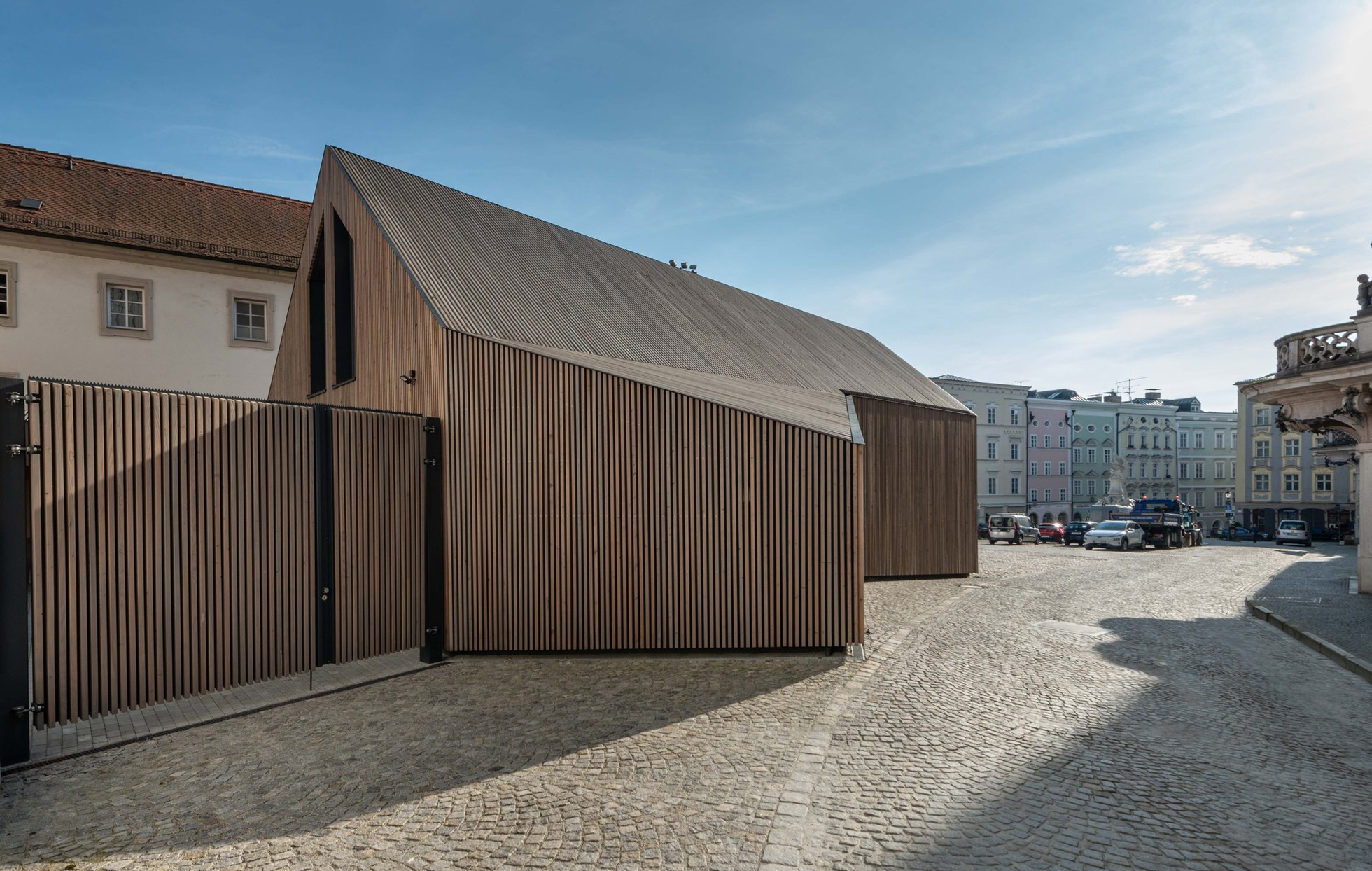 Erbaut in Massivholzbauweise und vom Dach über die Wände komplett umhüllt von einer fein detaillierten Hülle aus vertikalen Holzlatten interpretiert der Neubau der Staatlichen Dombauhütte Passau den Archetypus „Hütte“ überzeugend. Er gibt modernen Arbeitsplätzen für sieben Steinmetze samt Kranbahn funktionalen und angenehmen Raum ebenso wie einer Restaurierungswerkstatt, Lagerflächen und einem Werkhof mit Außenlager. In die anspruchsvolle Nachbarschaft auf dem Residenzplatz, dem Dom St. Stephan und der Neuen Bischöflichen Residenz, fügt die Dombauhütte sich sensibel ein: Respektvoll verjüngt sich der Grundriss konisch, um die Giebelansicht vom Platz aus möglichst klein erscheinen zu lassen, ein Annex nimmt die Nebenräume auf, bescheiden steigt der First. Tore und Fenster sind im geschlossenen Zustand schlicht in die Fassade integriert. Die Jury überzeugte die handwerkliche Gestaltung und gestalterische Zurückhaltung des vorbildlichen Zweckbaus, der der barocken Fassadenkunst nicht nur den Vortritt lässt, sondern sie angemessen zeitgemäß weiterschreibt. Seit 2020 zählt das Bauhüttenwesen zum immateriellen Kulturerbe der UNESCO. Dieser Bedeutung wird die Dombauhütte Passau gerecht.